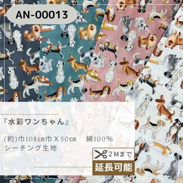 『 水彩ワンちゃん 』 シーチング生地 50cmカットクロス AN-00013