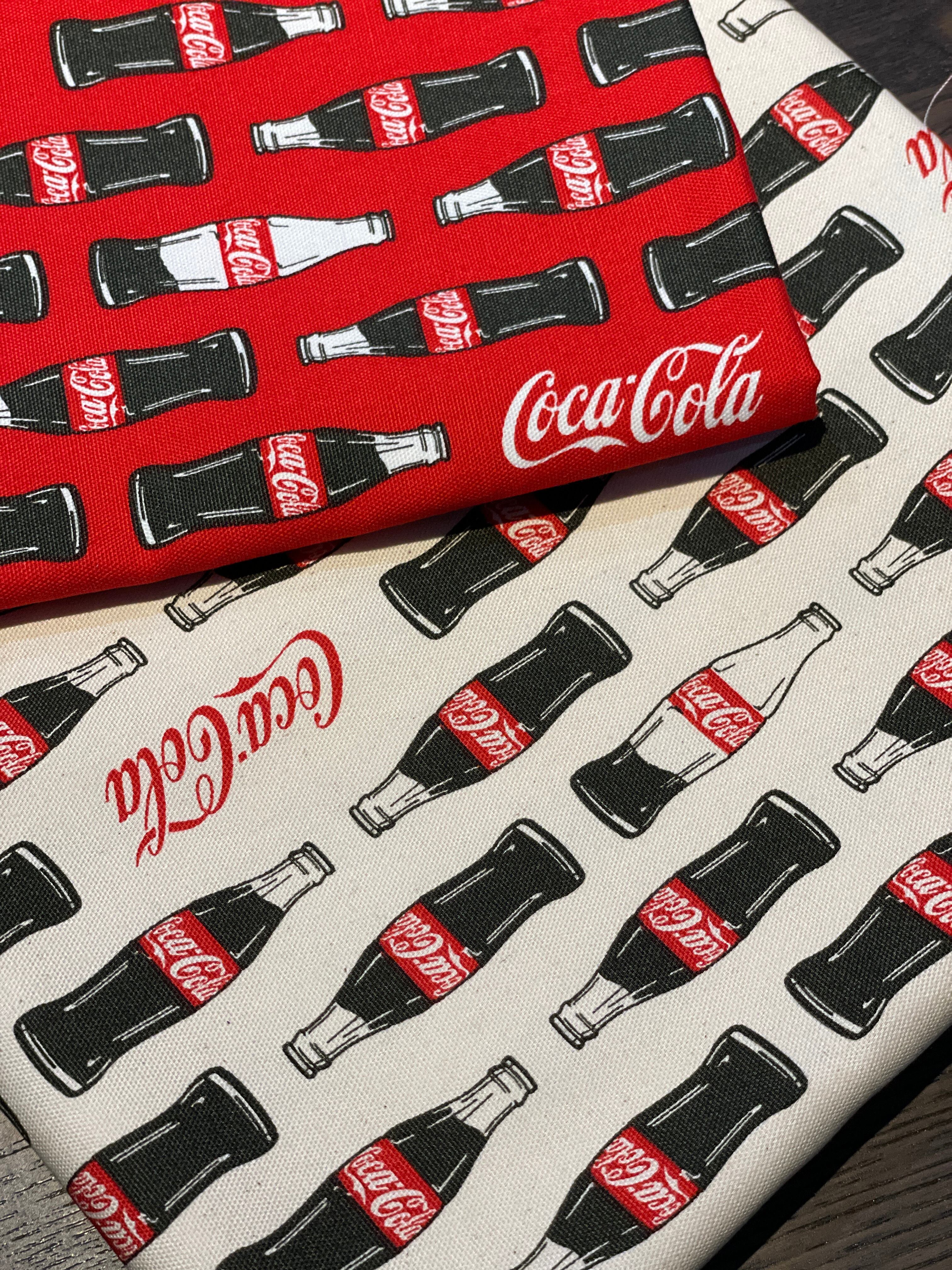人気の「コカ・コーラ」デザインが楽しめる、レトロ感あふれる瓶柄のオックスフォード生地です。